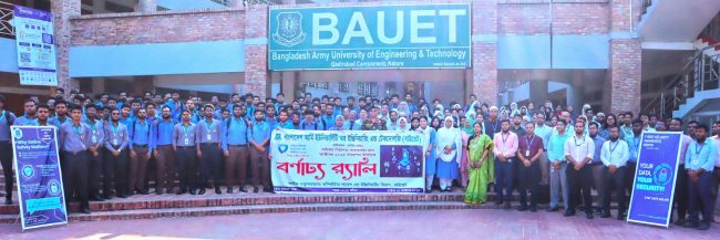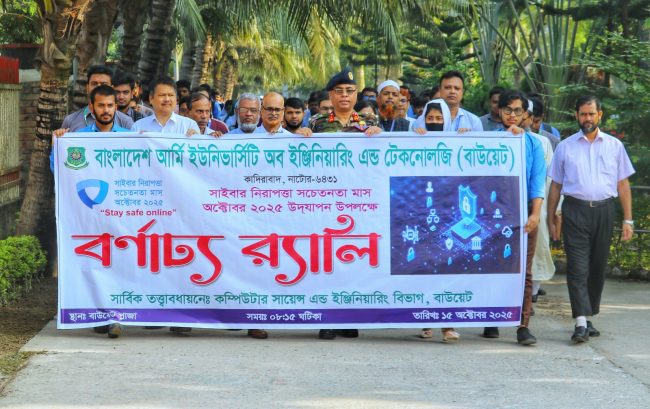 বাংলাদেশ আর্মি ইউনিভার্সিটি অব ইঞ্জিনিয়ারিং এন্ড টেকনোলজি (বাউয়েট) ক্যাম্পাসে সিএসই বিভাগের উদ্যোগে সাইবার নিরাপত্তা সচেতনতা মাস অক্টোবর উপলক্ষে বিভিন্ন কর্মসুচির মধ্যে র্যালি ও সাইবার সিকিউরিটি ক্যারিয়ার শীর্ষক কর্মশালা অনুষ্ঠিত হয়। গত বুধবার ১৫ অক্টোবর ২০২৫ তারিখে উক্ত কর্মশালায় প্রধান অতিথি হিসেবে উপস্থিত ছিলেন বিশ্ববিদ্যালয়ের মাননীয় উপাচার্য ব্রিগেডিয়ার জেনারেল এস এম লুৎফর রহমান।