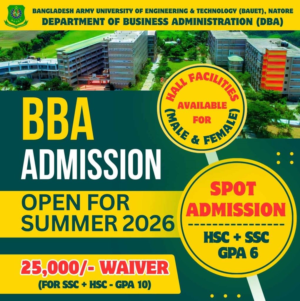 Bangladesh Army University of Engineering & Technology (BAUET), a premier educational institution under the Bangladesh Army, embarked on its journey in 2015 in Qadirabad, Natore, to contribute to the nation by providing high-quality higher education in engineering, technology and sciences.