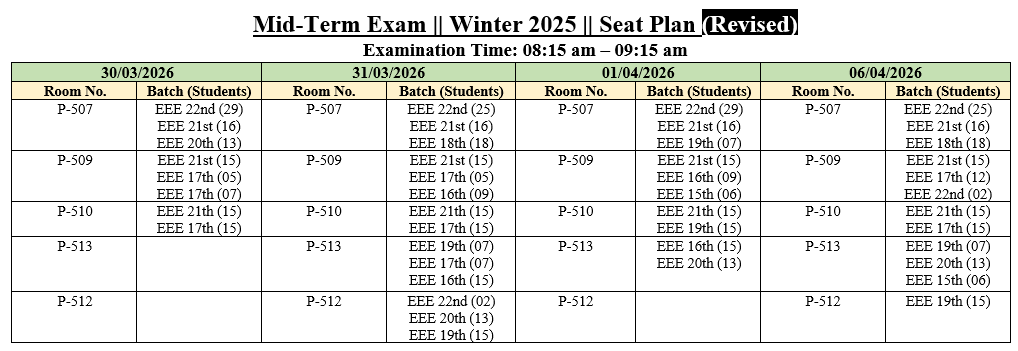 Mid-Term Exam (Seat Plan) Winter 2026 Mid -Term Routine (Winter-2025)-Revised Mid -Term Routine (Winter-2025) Notice for IDP-I Supervisor Allocation EEE 18th Batch Notice for Thesis Supervisor Allocation EEE 16th Batch Notice for Thesis-II and IDP-II Defense Sessional Examination Routine for Summer-2025 Notice of Board Viva for Summer- 2025 Notice for Thesis-I and IDP-I Proposal Submission Mid-Term Examination Routine for Summer 2025 Semester Notice for Thesis-I Supervisor Allocation (EEE 15th Batch) Notice for IDP-I Supervisor Allocation (EEE 17th Batch) Notice for Submission of Thesis-II/IDP-II Draft Reports and Plagiarism Reports Thesis Supervisor Allocation 13th Batch (Revised) Notice for IDP and Thesis Defense Training for Laboratory staff of EEE Department Sessional Examination Routine for Fall-2024 Notice of Board Viva for Fall-24 Notice for IDP-I Supervisor Allocation (EEE 16th Batch) Notice for Thesis/Project Supervisor Allocation EEE 14th Batch Thesis Supervisor Allocation EEE 13th Batch Industrial Attachment Report Submission & Presentation Notice for Thesis and IDP Defense of EEE 11th 12th 13th and 14th Batch Exam routine Fall 2023