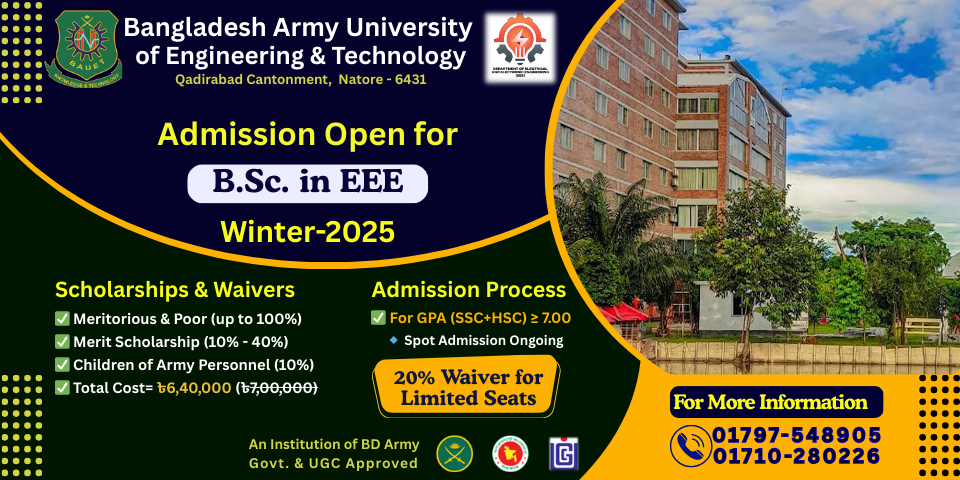 NB: Applicants who have obtained a total GPA of 7.00 together in HSC/Alim or equivalent and SSC/Dakhil & Diploma holders (SSC/Dakhil GPA 4.00 in Science Group & Diploma in Engineering CGPA 3.00) are eligible for direct admission through viva-voce immediately after the circular with the following documents: SSC & HSC Original Mark sheets, Certificates, NID/Birth Certificate, 06 Copies PP size photo, Parents’ NID photocopies.
