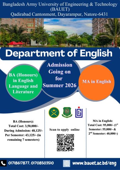 Bangladesh Army University of Engineering & Technology (BAUET), a premier educational institution under the Bangladesh Army, embarked on its journey in 2015 in Qadirabad, Natore, to contribute to the nation by providing high-quality higher education in engineering, technology and sciences.