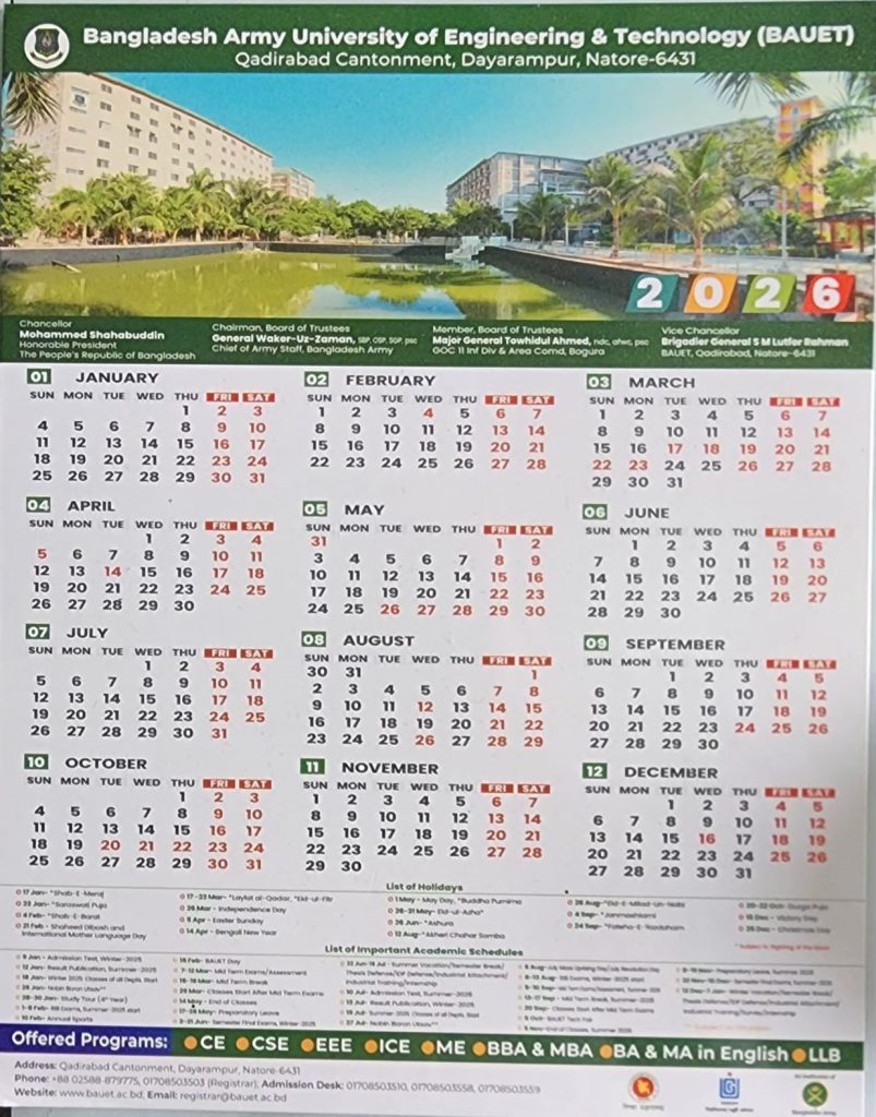 Bangladesh Army University of Engineering & Technology (BAUET), a premier educational institution under the Bangladesh Army, embarked on its journey in 2015 in Qadirabad, Natore, to contribute to the nation by providing high-quality higher education in engineering, technology and sciences.