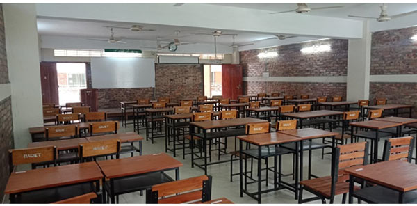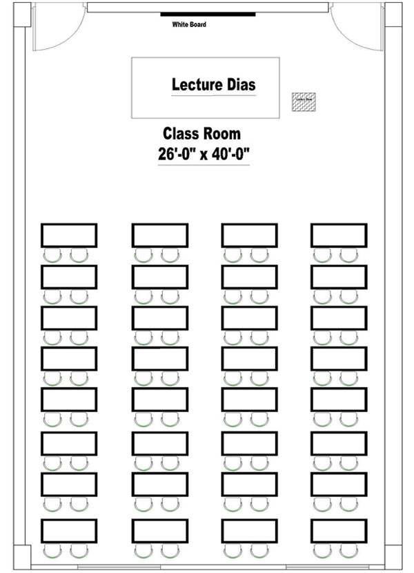 There is an adequate number of classrooms which are well decorated and equipped with modern technologies such as smart boards, multimedia projectors, audio-visual system’s, and internet facilities. The classroom size is large enough to accommodate 40 to 60 students. The department of ICE has a total number of 8 classrooms available for undergraduate students. All the classrooms are decorated with adequate numbers of furniture, electrical items, and teaching aid facilities i.e., chair, tables, display board, dais, light, fan, projector, and screen, etc. All classrooms have enough doors and windows to pass the air as well as having an emergency exit. In case of any emergency, a fire extinguisher can be used located in front of each classroom. All the classrooms have the same layout. Necessary data and the classroom layout are given below: