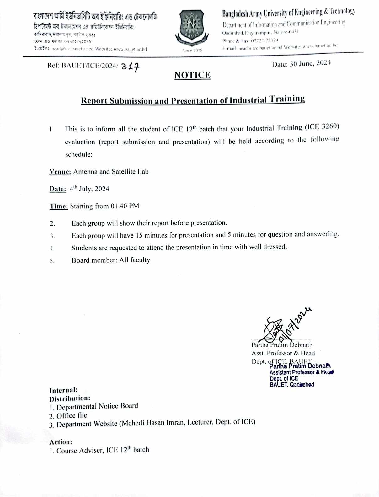 Regarding Report Submission and Presentation of Industrial Training (ICE 11 & 12 Batch)